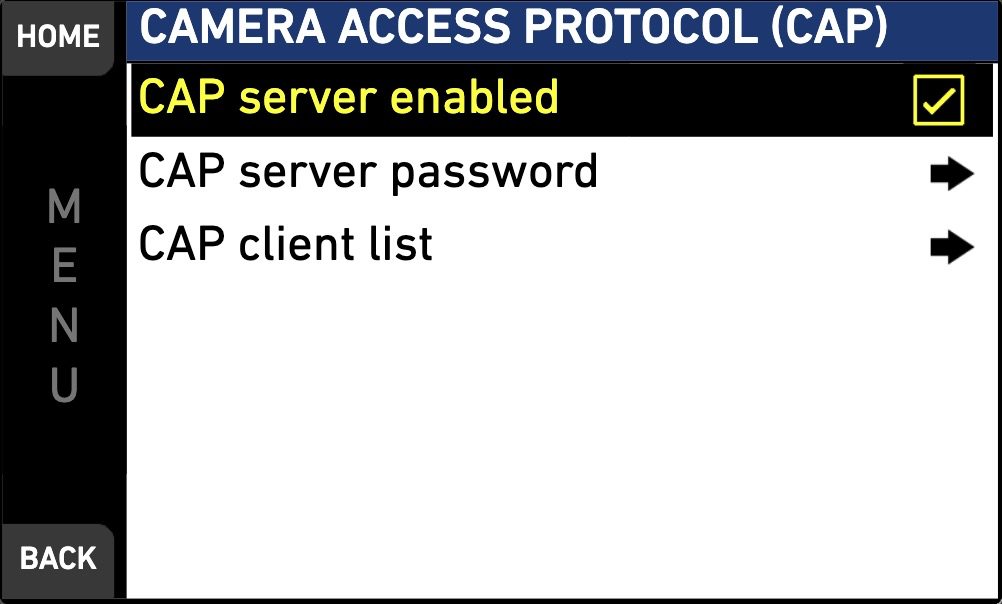 2. Enable CAP server by checking the CAP server enabled box, you will then need to set a password in the CAP server password submenu. By default it is "arri".