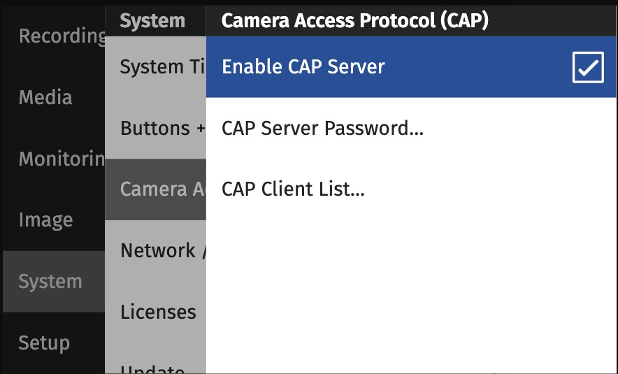 2. Enable CAP by setting the Enable CAP server checkbox, you will then need to set a password in the CAP server Password submenu. By default it is "arri".